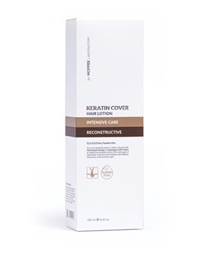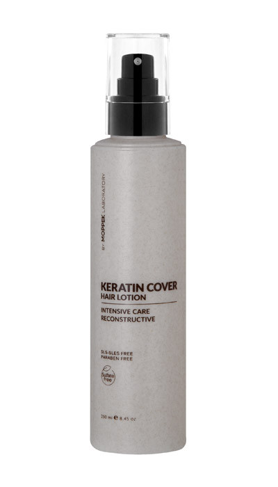 کراتینه کردن مو، روشی است که امروزه به عنوان یکی از راه های درمان خشکی، زبری و عدم حالت پذیری موها معرفی می شود. طی این روش، ماده کراتین (شبیه به ساختار طبیعی) با حرارت فعال شده و از طریق اتوکشی به تارهای مو می چسبد. سپس، سطح لایه خارجی تارها که پیش از آن زبر و خشک بود، صاف و یکدست می شود و تارهای مو به راحتی بر روی یکدیگر قرار می گیرند. ماندگاری آثار کراتین بر روی مو موقت بوده و بستگی به شیوه مراقبت از آن دارد؛ یعنی رعایت دوران قرنطینه، خشک کردن موها پس از هر بار شست و شو و استفاده از محصولاتی که فاقد ترکیبات سولفات هستند. لابراتوار تخصصی موپک با بهره گیری از آخرین تحقیقات علمی، لوسیون کراتین کاور را به عنوان اولین لوسیون مناسب موهای کراتین شده به بازار معرفی نمود که قادر است ماندگاری آثار کراتین، بوتاکس (BOTOX) یا ریباندینگ (REBONDING) را بر روی مو به طرز چشمگیری حفظ نماید. در فرمولاسیون منحصر به فرد این لوسیون از پپتایدهای هیدرولیز شده کراتین و ابریشم، روغن های آرگان و بادام شیرین استفاده شده است تا بتواند با تغذیه کردن و هیدراته نگه داشتن لایه های کوتیکولی، لطافت و درخشش بی نظیری ایجاد کند.