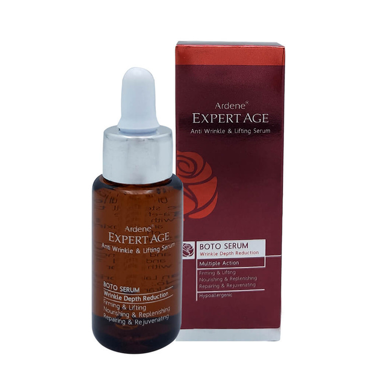سرم ضد چروک و سفت کننده پوست آردن مدل Expert Age، قابلیت نفوذ بالا و جذب سریع دارد و به ریلکس سازی ماهیچههای صورت کمک می کند. این سرم ضد چروک بسیار قوی با عملکردی شبه بوتاکس چروک ها را از بین می برد و به صاف و یکدست شدن پوست کمک می کند. از این محصول می توان جهت از بین بردن چروک های پوست صورت، گردن، دکلته، خط اخم و خنده استفاده کرد. جوانسازی پوست و تحریک آن برای ساخت بیشتر کلاژن و افزایش خاصیت الاستین پوست کار دیگری ست که این سرم برای درمان پوست انجام می دهد